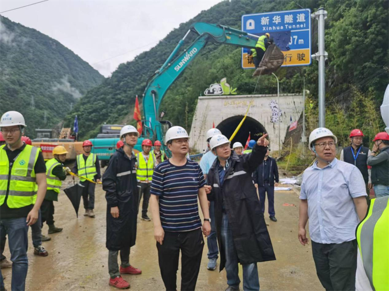 曹剛一行抵達寶興河電站,徒步前往新華村寶興河壅塞體查看災情,附后前往新華村隧道口,看望慰問在搶通一線的交建集團施工人員,詳細了解搶通進度和安全保障措施等情況。