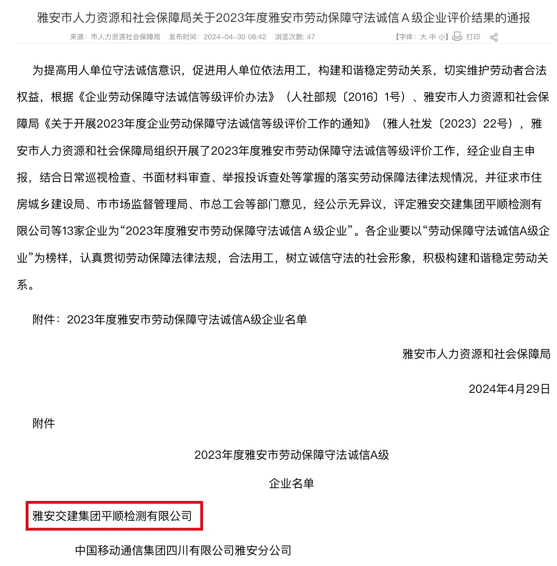 近日,雅安市人社局發(fā)布通報(bào),雅安交建集團(tuán)平順公司被評(píng)定為“2023年度雅安市勞動(dòng)保障守法誠(chéng)信A級(jí)企業(yè)”。此次評(píng)選由人社局結(jié)合日常巡視檢查、書(shū)面材料審查、舉報(bào)投訴查處以及專項(xiàng)檢查等活動(dòng)掌握的落實(shí)勞動(dòng)保障法律法規(guī)情況,并征求市場(chǎng)監(jiān)管局等部門(mén)和單位意見(jiàn)后,綜合評(píng)定而出。