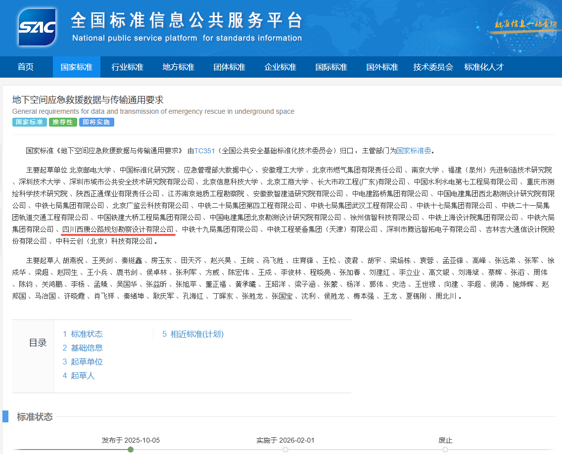近日,由四川西康公路規(guī)劃勘察設(shè)計(jì)有限公司參與編制的推薦性國(guó)家標(biāo)準(zhǔn)GB/T 46338-2025《地下空間應(yīng)急救援?dāng)?shù)據(jù)與傳輸通用要求》經(jīng)國(guó)家標(biāo)準(zhǔn)委批準(zhǔn)正式發(fā)布,將于2026年2月1日起正式實(shí)施。