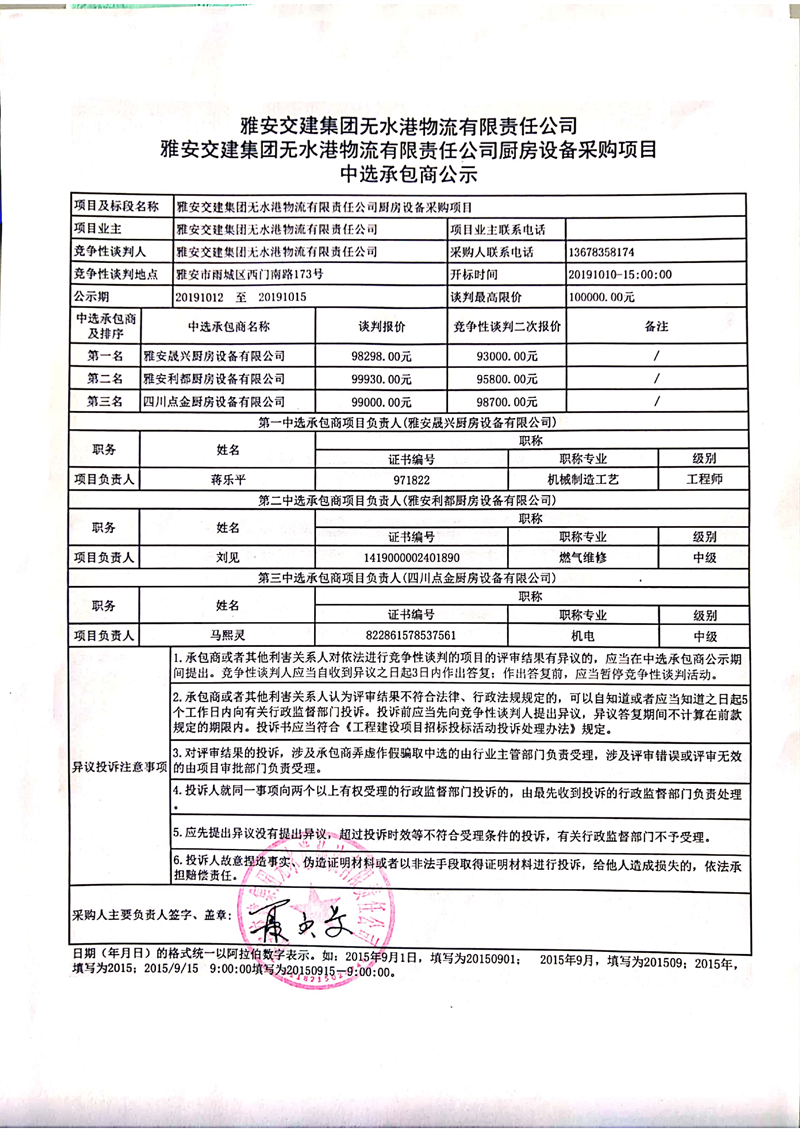 雅安交建集團(tuán)無水港物流有限責(zé)任公司廚房設(shè)備采購項目中選承包商公示