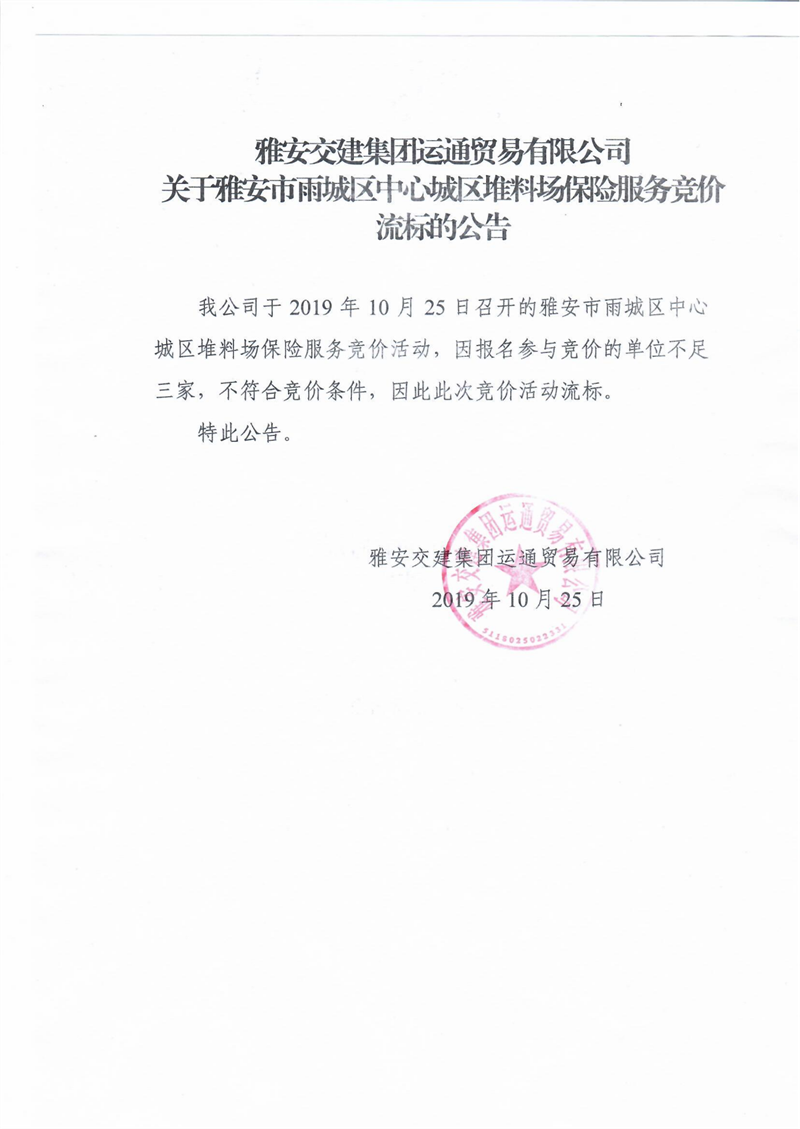 雅安交建集團(tuán)運(yùn)通貿(mào)易有限公司關(guān)于雅安市雨城區(qū)中心城區(qū)堆料場保險服務(wù)競價流標(biāo)的公告
