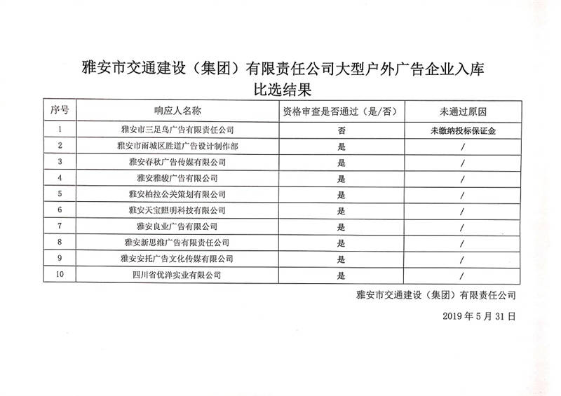 雅安市交通建設(集團)有限責任公司大型戶外廣告企業(yè)入庫比選結果