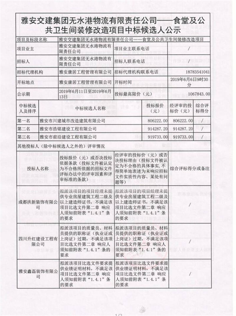 雅安交建集團無水港物流有限公司食堂及公共衛(wèi)生間裝修改造項目中標候選人公示