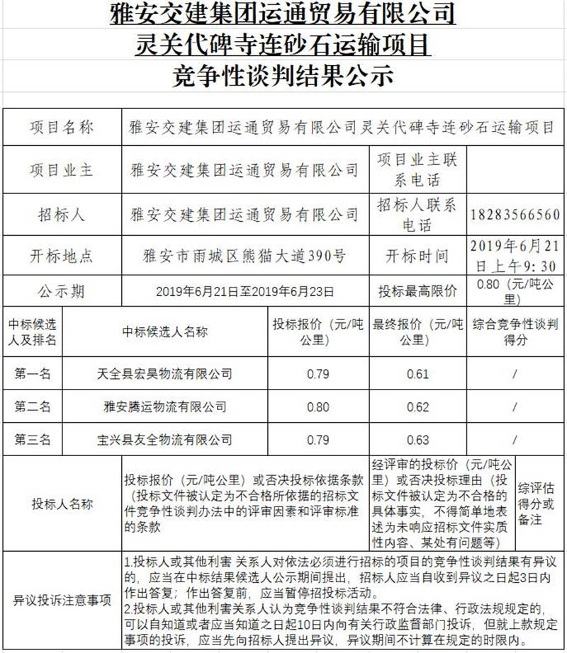 雅安交建集團(tuán)運通貿(mào)易有限公司靈關(guān)代碑寺連砂石運輸項目競爭性談判結(jié)果公示