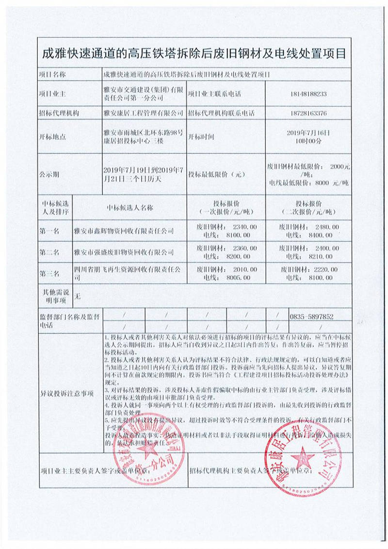 雅安市交通建設(shè)(集團(tuán))有限責(zé)任公司第一分公司成雅快速通道的高壓鐵塔拆除后廢舊鋼材及電線處置項(xiàng)目競價結(jié)果公示
