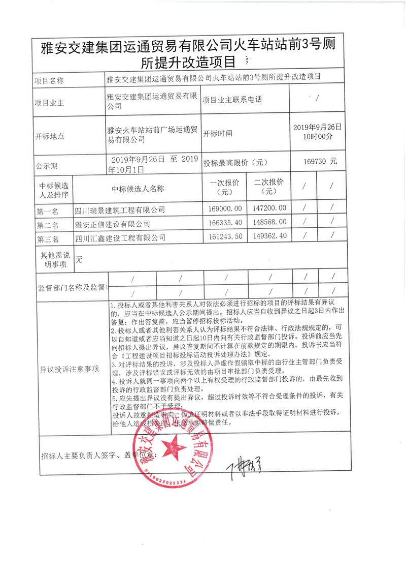 雅安交建集團(tuán)運(yùn)通貿(mào)易有限公司火車站站前廣場(chǎng)3號(hào)廁所改造提升項(xiàng)目(第二次)競(jìng)爭(zhēng)性談判結(jié)果公示