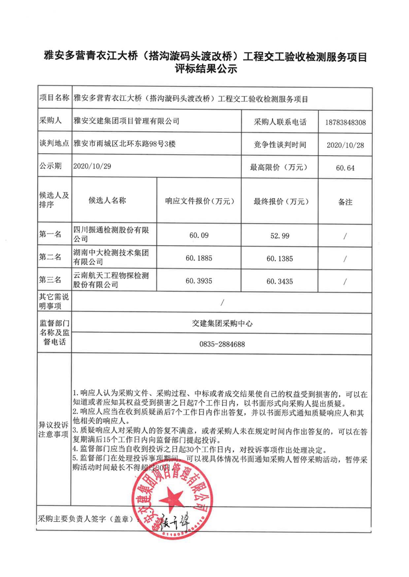 雅安交建集團項目管理有限公司雅安多營青衣江大橋(搭溝漩碼頭渡改橋)工程交工驗收檢測服務項目評標結果公示