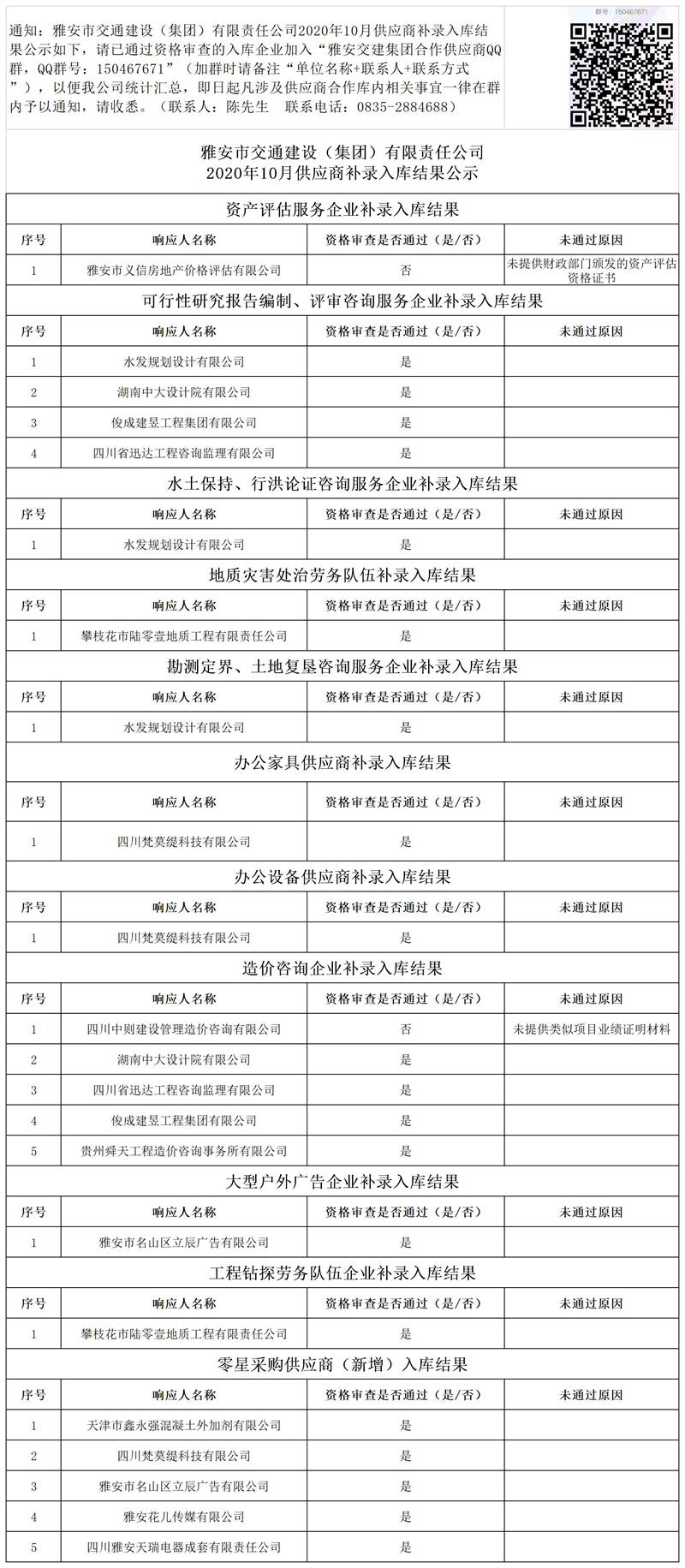 雅安市交通建設(shè)(集團(tuán))有限責(zé)任公司2020年10月供應(yīng)商補(bǔ)錄入庫結(jié)果公示