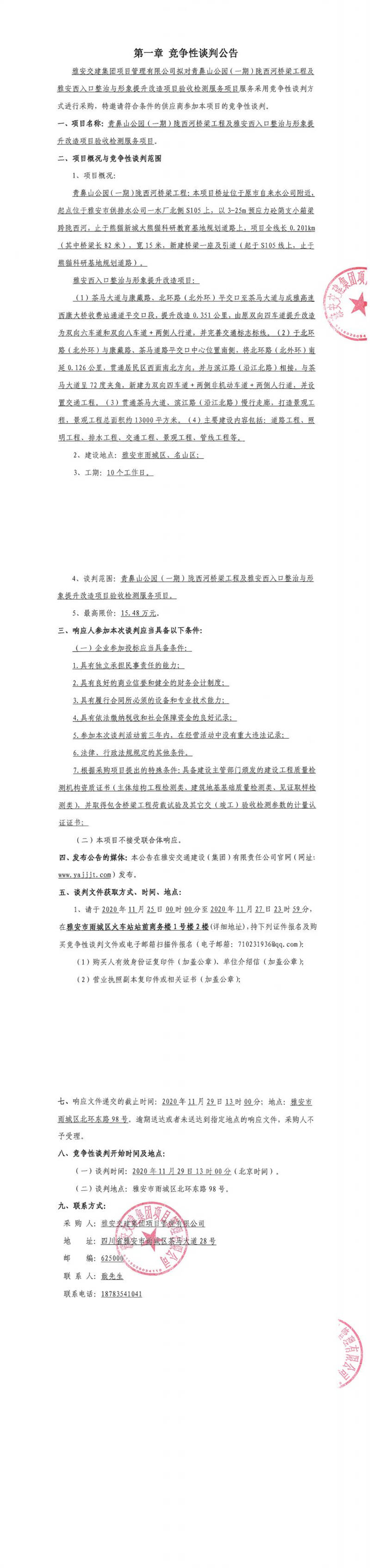 雅安交建集團(tuán)項(xiàng)目管理有限公司青鼻山公園(一期)隴西河橋梁工程及雅安西入口整治與形象提升改造項(xiàng)目驗(yàn)收檢測服務(wù)項(xiàng)目競爭性談判公告