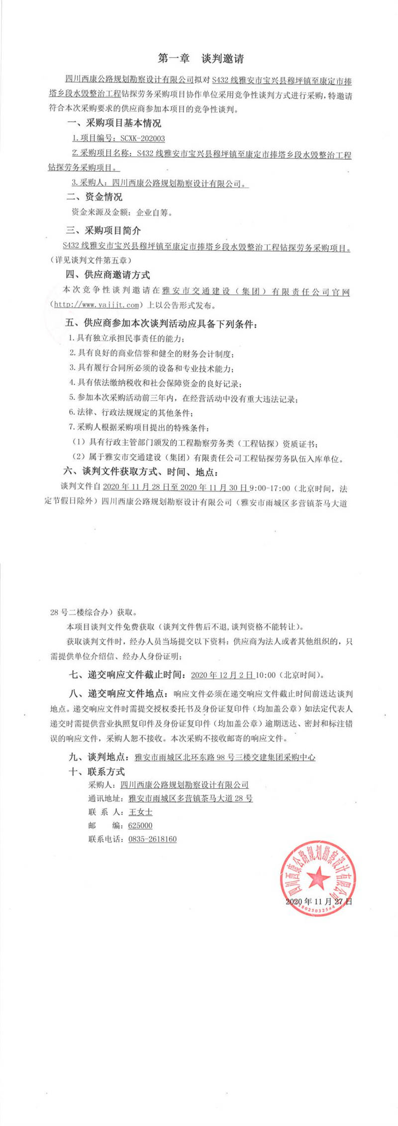 四川西康公路規(guī)劃勘察設(shè)計有限公司S432線雅安市寶興縣穆坪鎮(zhèn)至康定市捧塔鄉(xiāng)段水毀整治工程鉆探勞務(wù)采購項目談判公告