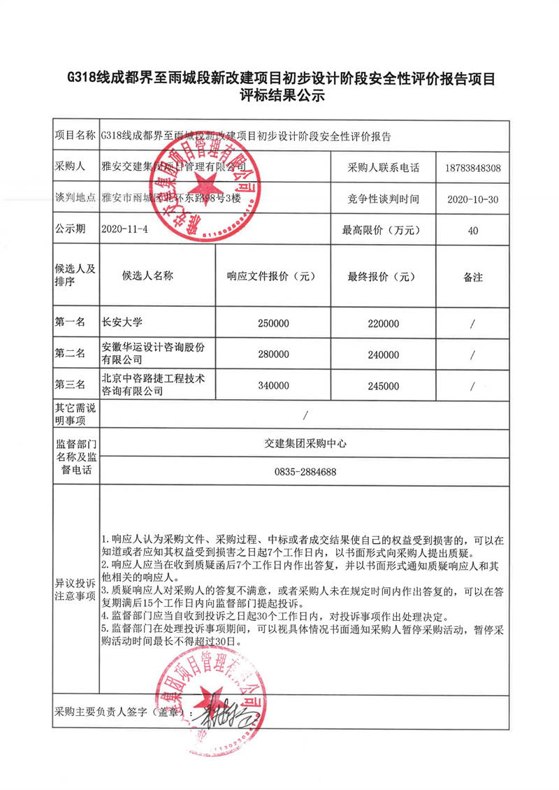 雅安交建集團(tuán)項(xiàng)目管理有限公司G318線成都界至雨城段新改建項(xiàng)目初步設(shè)計階段安全性評價報告項(xiàng)目評標(biāo)結(jié)果公示