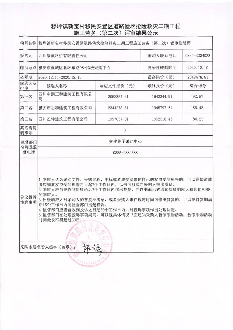 四川康藏路橋有限責(zé)任公司穆坪鎮(zhèn)新寶村移民安置區(qū)道路堡坎搶險(xiǎn)救災(zāi)二期工程施工勞務(wù)(第二次)評審結(jié)果公示