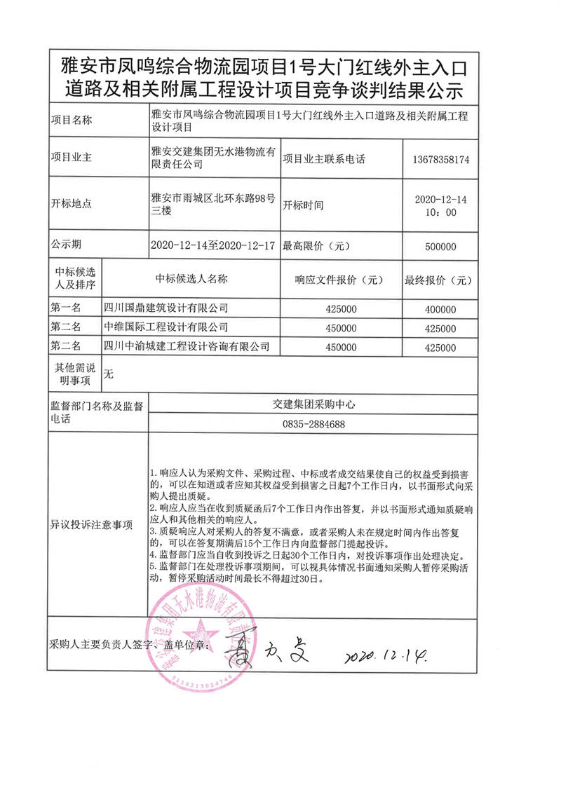 雅安交建集團(tuán)無(wú)水港物流有限責(zé)任公司雅安市鳳鳴綜合物流園項(xiàng)目1號(hào)大門(mén)紅線外主入口道路及相關(guān)附屬工程設(shè)計(jì)項(xiàng)目談判結(jié)果公示