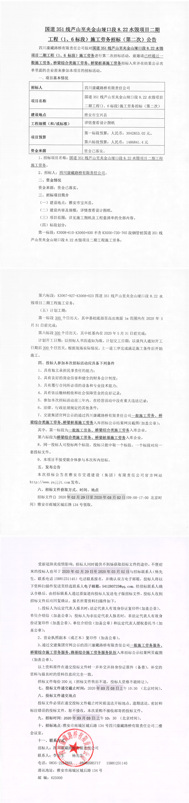 四川康藏路橋有限責(zé)任公司國道351線蘆山至夾金山埡口8.22水毀項目二期工程(1、6標段)施工勞務(wù)招標(第二次)公告