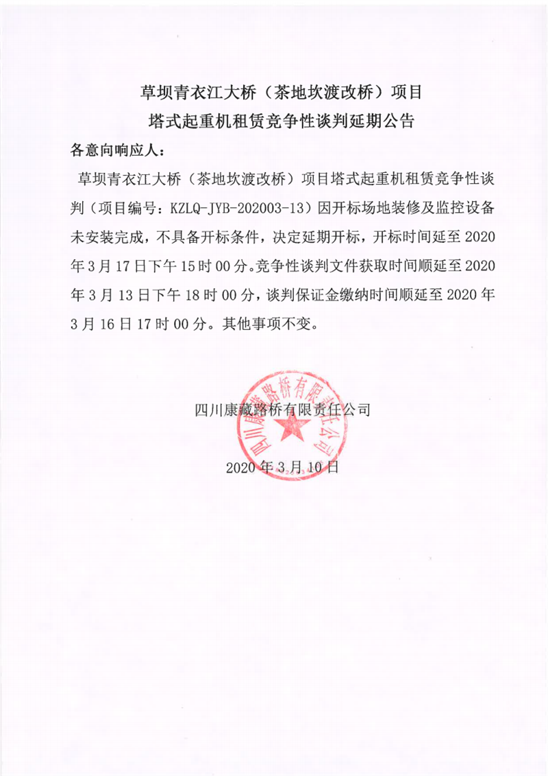 四川康藏路橋有限責(zé)任公司草壩青衣江大橋(茶地坎碼頭渡改橋)項目塔式起重機租賃競爭性談判延期公告