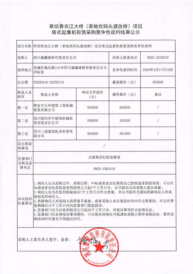 四川康藏路橋有限責(zé)任公司草壩青衣江大橋(茶地坎渡改橋)項(xiàng)目塔式起重機(jī)租賃采購競爭性談判結(jié)果公示