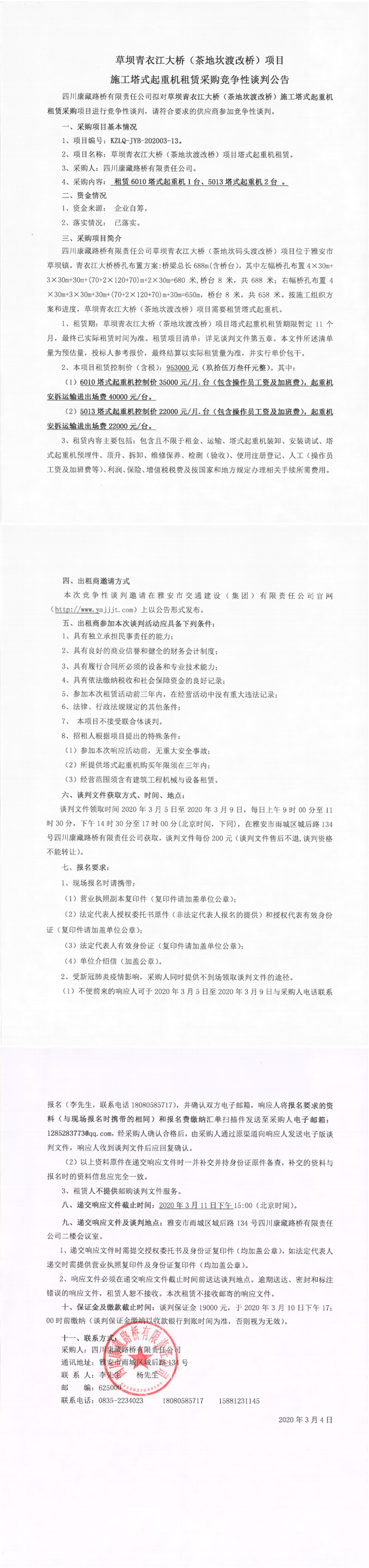 四川康藏路橋有限責任公司草壩青衣江大橋(茶地坎渡改橋)項目塔式起重機租賃采購競爭性談判結(jié)果公示