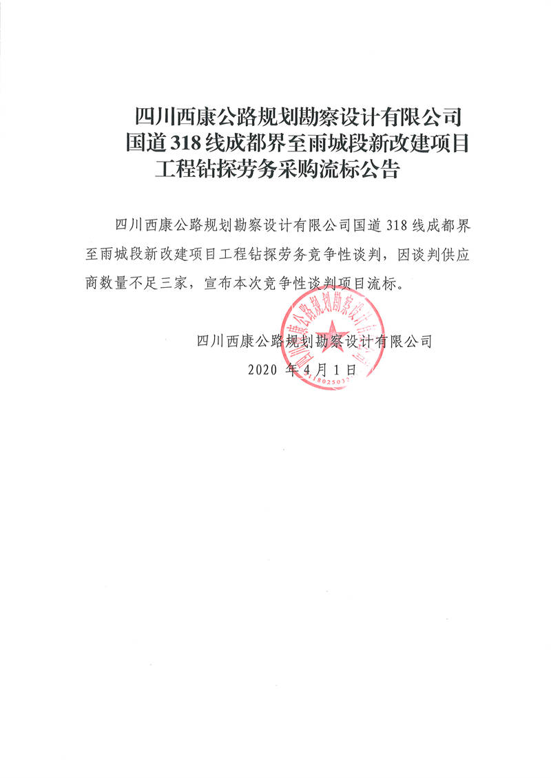四川西康公路規(guī)劃勘察設(shè)計(jì)有限公司國道318線成都界至雨城段新改建項(xiàng)目工程鉆探勞務(wù)采購流標(biāo)公告