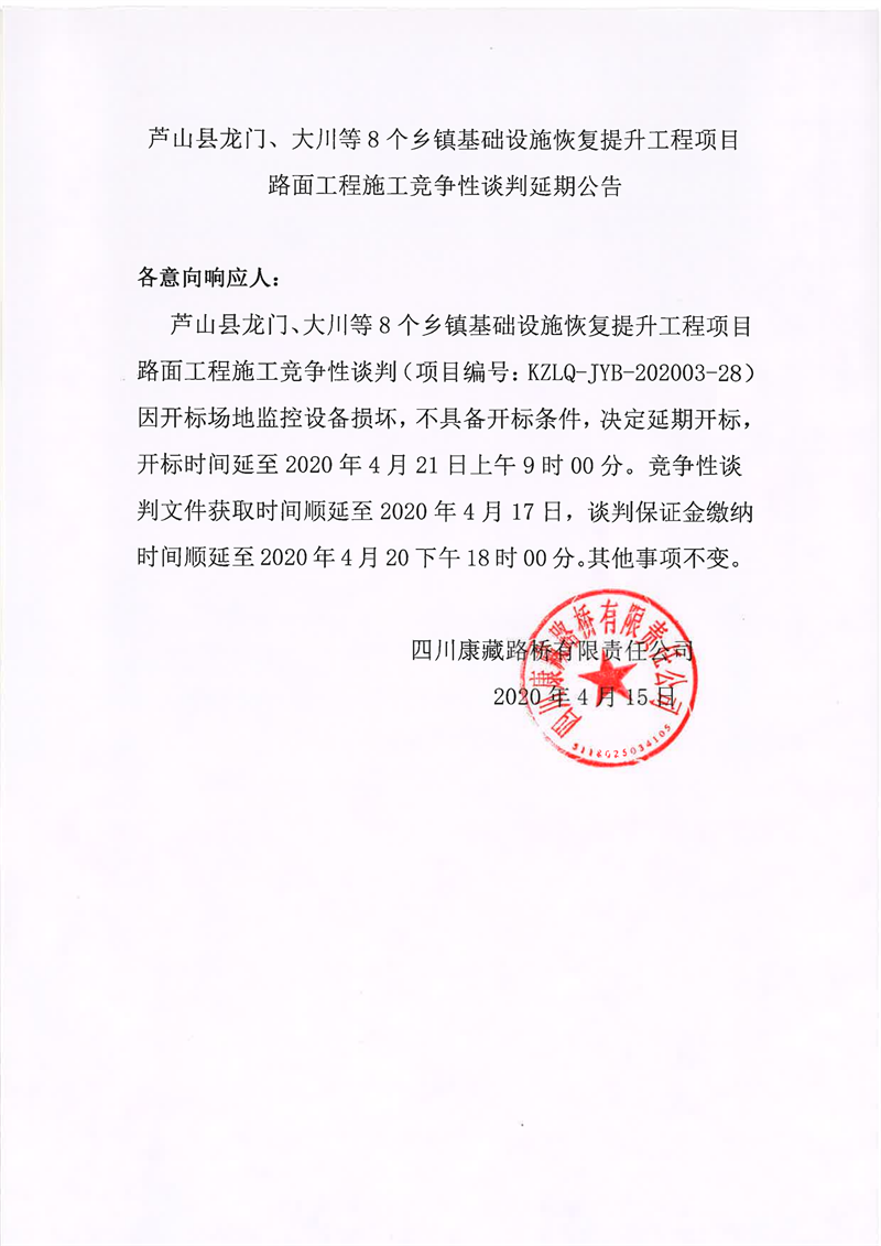 四川康藏路橋有限責(zé)任公司蘆山縣龍門、大川等8個鄉(xiāng)鎮(zhèn)基礎(chǔ)設(shè)施恢復(fù)提升工程項目路面工程施工競爭性談判延期公告