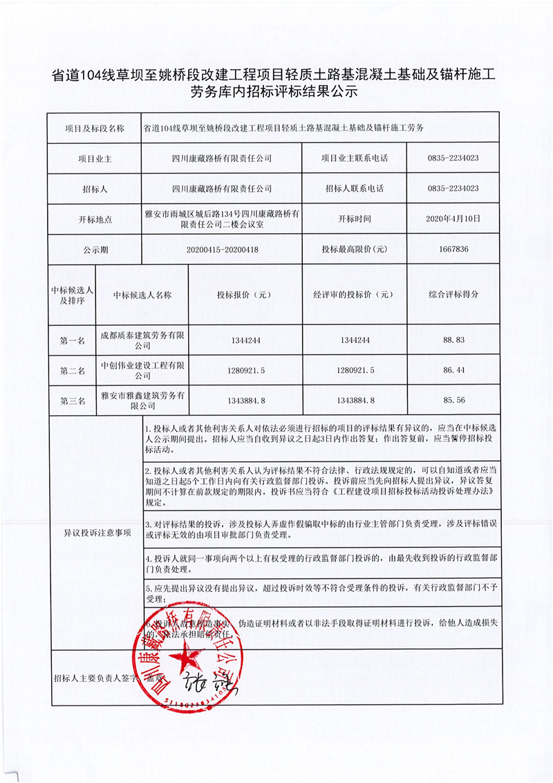 四川康藏路橋有限責(zé)任公司省道104線草壩至姚橋段改建工程項(xiàng)目輕質(zhì)土路基混凝土基礎(chǔ)及錨桿施工勞務(wù)庫(kù)內(nèi)招標(biāo)評(píng)標(biāo)結(jié)果公示