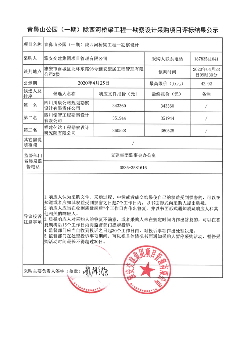 雅安交建集團項目管理有限公司青鼻山公園(一期)隴西河橋梁工程項目勘察設計采購項目評標結果公示