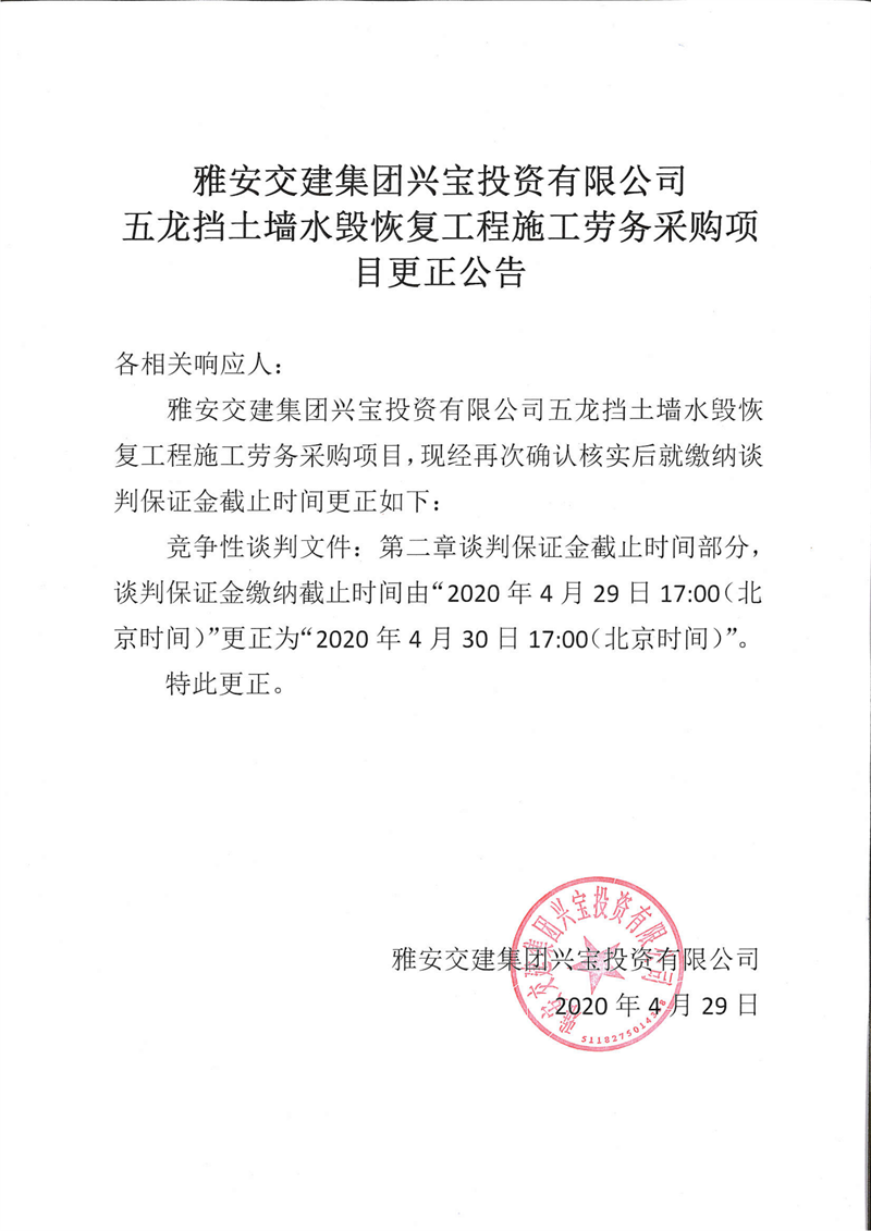 雅安交建集團興寶投資有限公司五龍擋土墻水毀恢復工程施工勞務采購項目更正公告