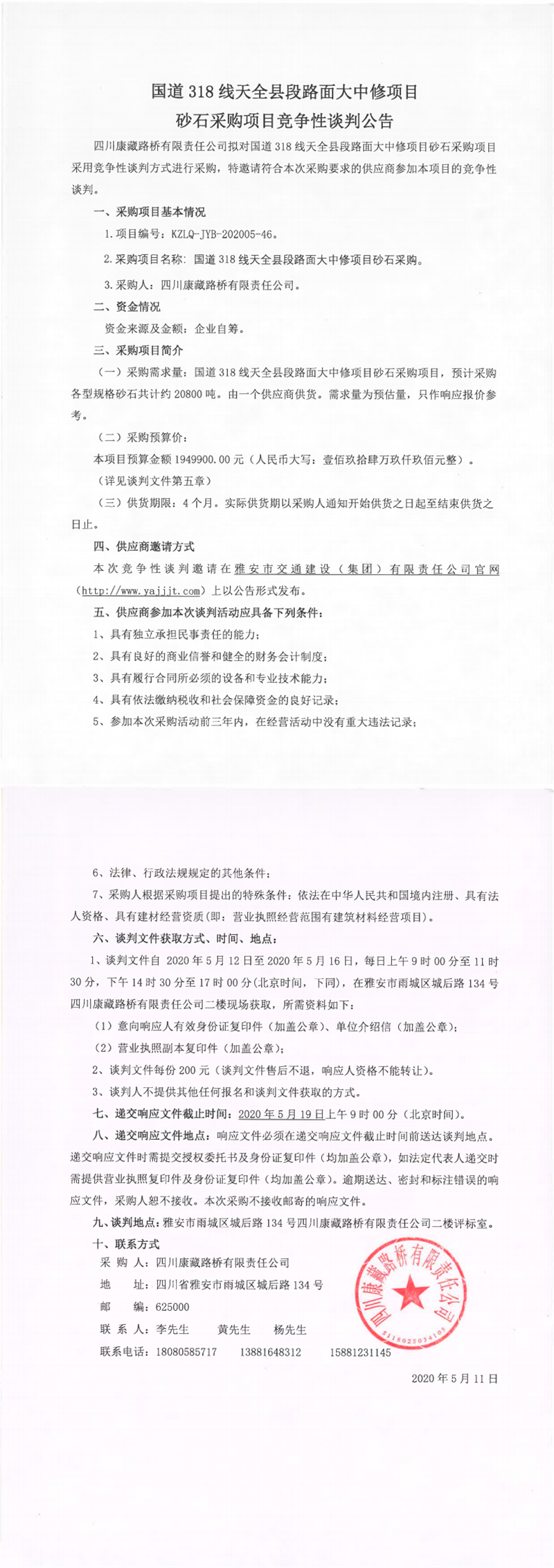 四川康藏路橋有限責任公司國道318線天全縣段路面大中修項目砂石采購項目競爭性談判公告