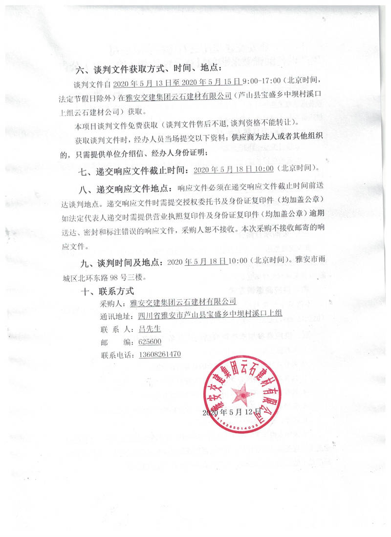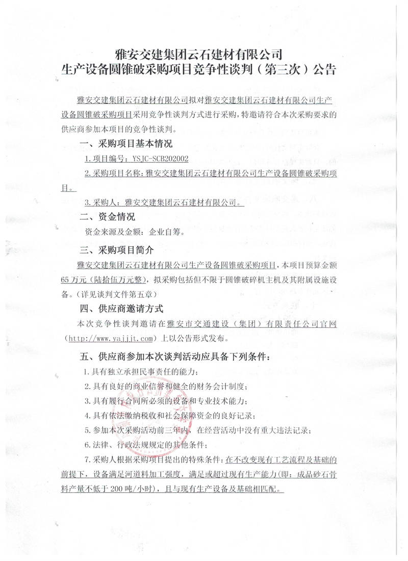 雅安交建集團云石建材有限公司生產(chǎn)設備圓錐破采購項目競爭性談判(第三次)公告