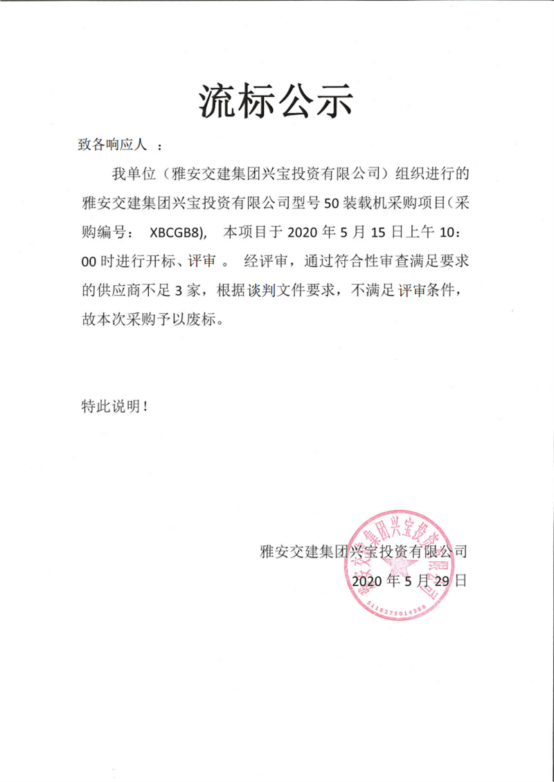 雅安交建集團興寶投資有限公司型號50裝載機采購項目流標公示