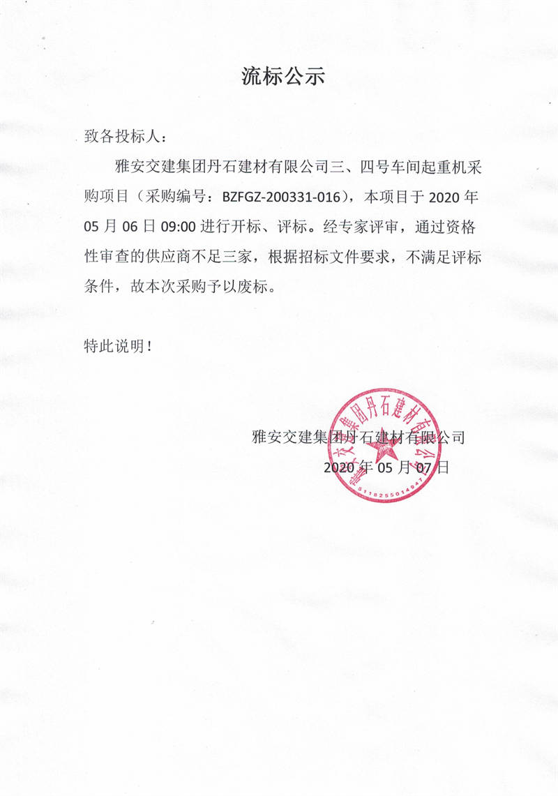 雅安交建集團(tuán)丹石建材有限公司三、四號(hào)車間起重機(jī)采購項(xiàng)目流標(biāo)公示