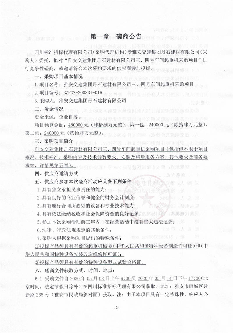雅安交建集團(tuán)丹石建材有限公司三、四號(hào)車(chē)間起重機(jī)采購(gòu)項(xiàng)目競(jìng)爭(zhēng)性磋商公告