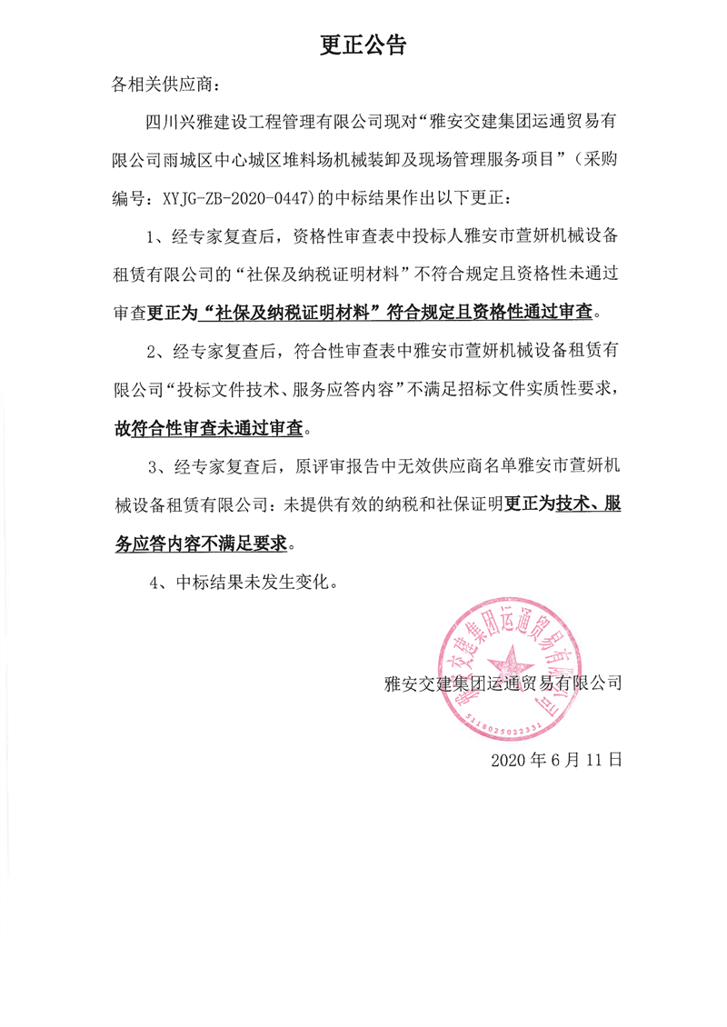 雅安交建集團(tuán)運通貿(mào)易有限公司雨城區(qū)中心城區(qū)堆料場機(jī)械裝卸及現(xiàn)場管理服務(wù)項目更正公告