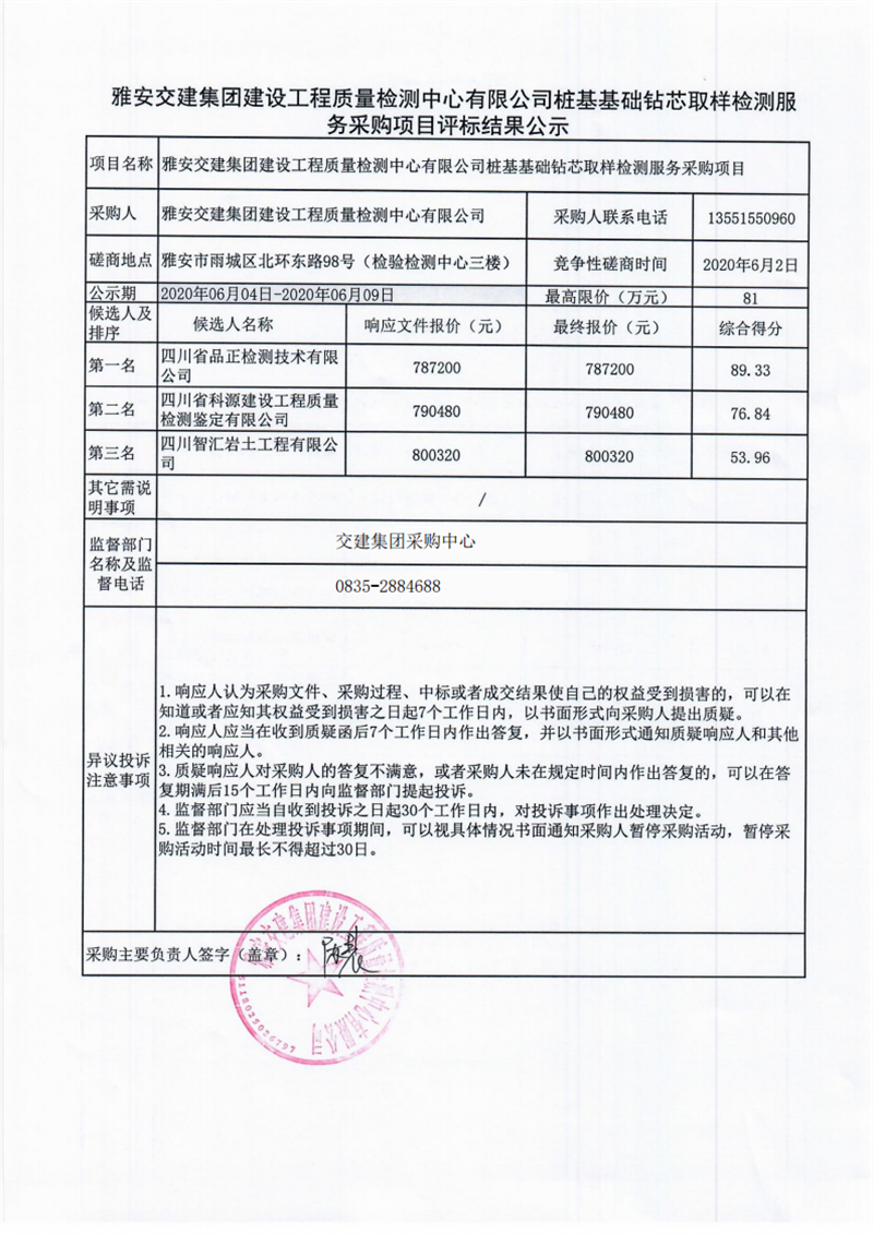 雅安交建集團建設工程質量檢測中心有限公司樁基基礎鉆芯取樣檢測服務采購項目評標結果公示