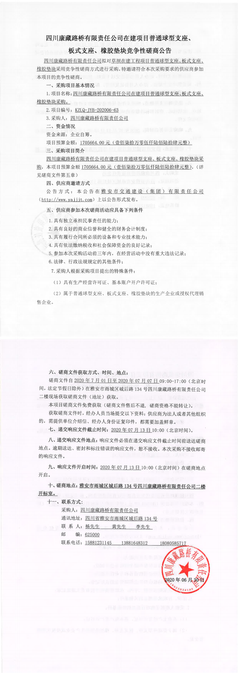 四川康藏路橋有限責(zé)任公司在建項(xiàng)目普通球型支座、板式支座、橡膠墊塊采購(gòu)競(jìng)爭(zhēng)性磋商公告