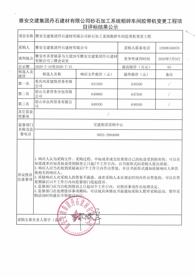 雅安交建集團(tuán)丹石建材有限公司砂石加工系統(tǒng)粗碎車間膠帶機(jī)變更工程項目評標(biāo)結(jié)果公示