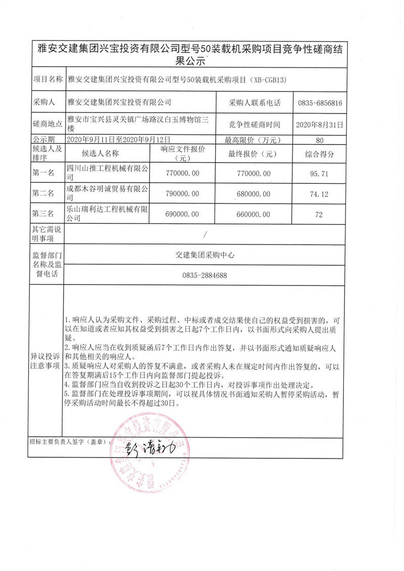 雅安交建集團(tuán)興寶投資有限公司型號(hào)50裝載機(jī)采購(gòu)項(xiàng)目競(jìng)爭(zhēng)性磋商結(jié)果公示