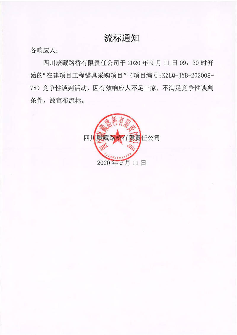 四川康藏路橋有限責(zé)任公司在建項(xiàng)目工程錨具采購(gòu)競(jìng)爭(zhēng)性談判流標(biāo)通知