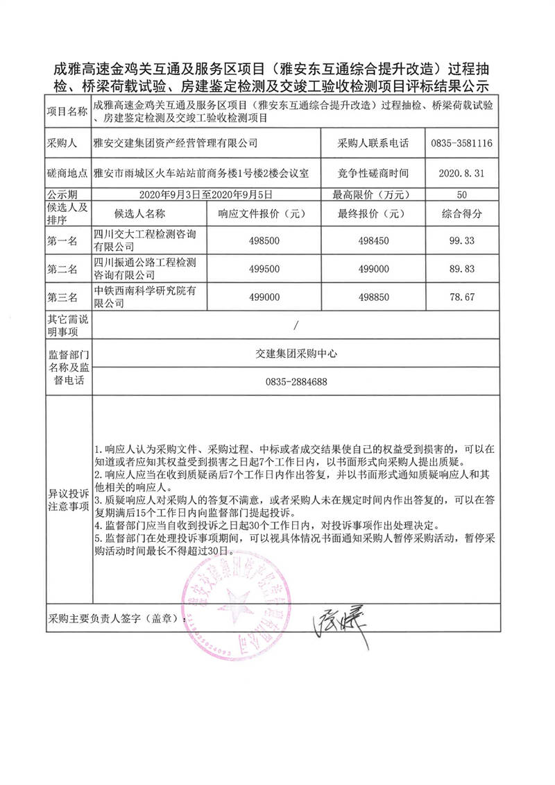 雅安交建集團(tuán)資產(chǎn)經(jīng)營(yíng)管理有限公司成雅高速金雞關(guān)互通及服務(wù)區(qū)項(xiàng)目(雅安東互通綜合提升改造)過程抽檢、橋梁荷載試驗(yàn)、房建鑒定檢測(cè)及交竣工驗(yàn)收檢測(cè)項(xiàng)目評(píng)標(biāo)結(jié)果公示