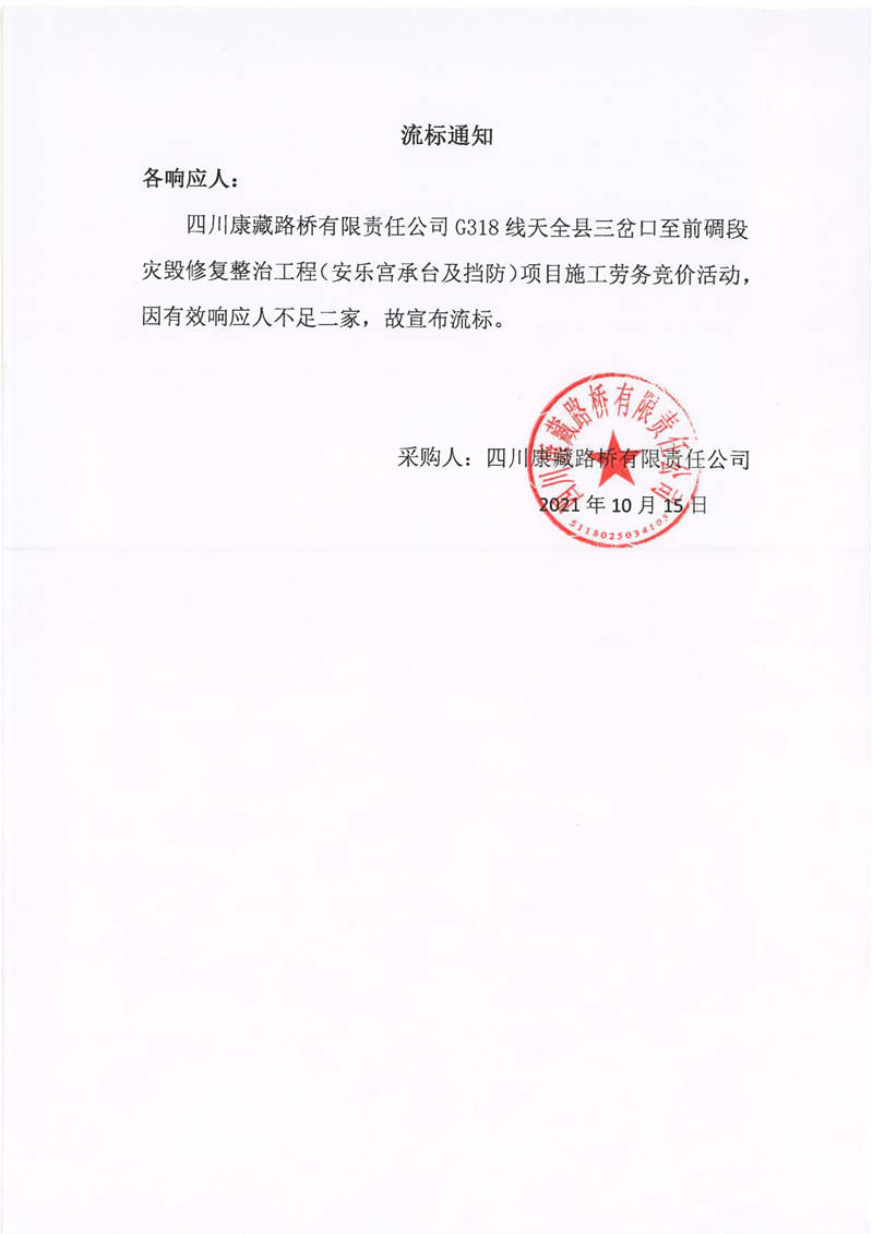 四川康藏路橋有限責(zé)任公司G318線天全縣三岔口至前碉段災(zāi)毀修復(fù)整治工程(安樂宮承臺及擋防)項目施工勞務(wù)流標通知