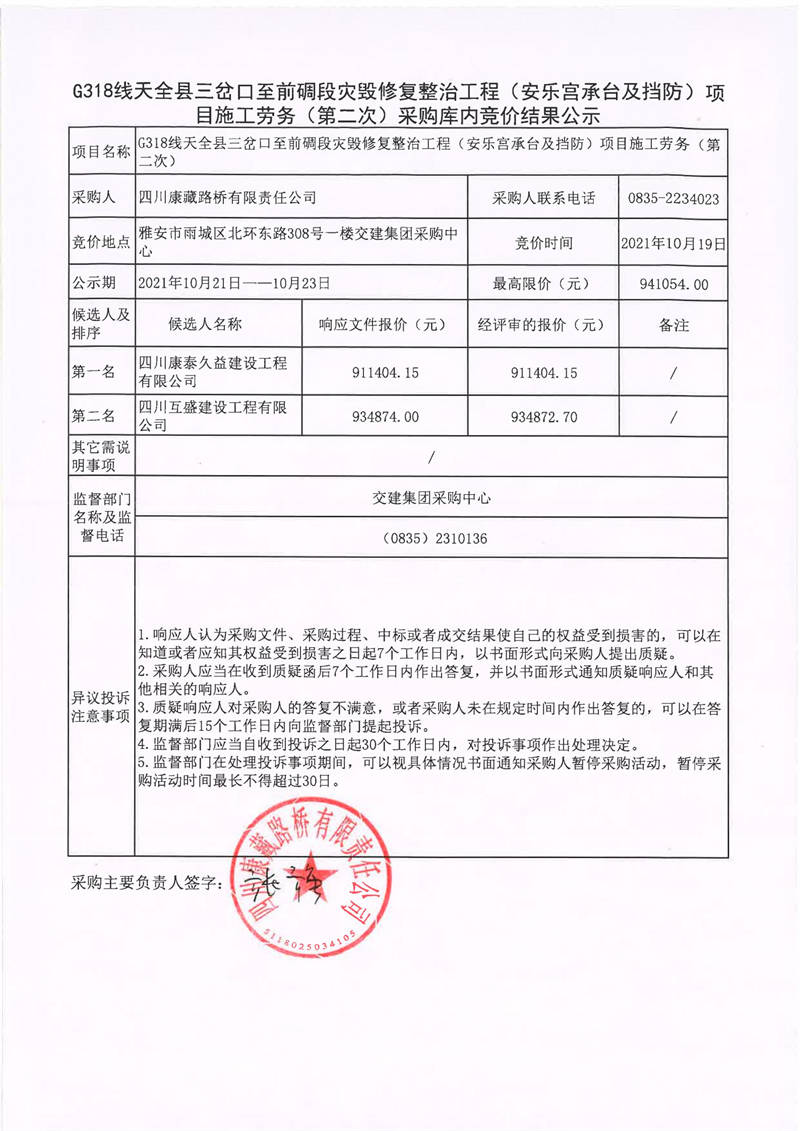 四川康藏路橋有限責(zé)任公司G318線天全縣三岔口至前碉段災(zāi)毀修復(fù)整治工程(安樂(lè)宮承臺(tái)及擋防)項(xiàng)目施工勞務(wù)(第二次)采購(gòu)庫(kù)內(nèi)競(jìng)價(jià)結(jié)果公示