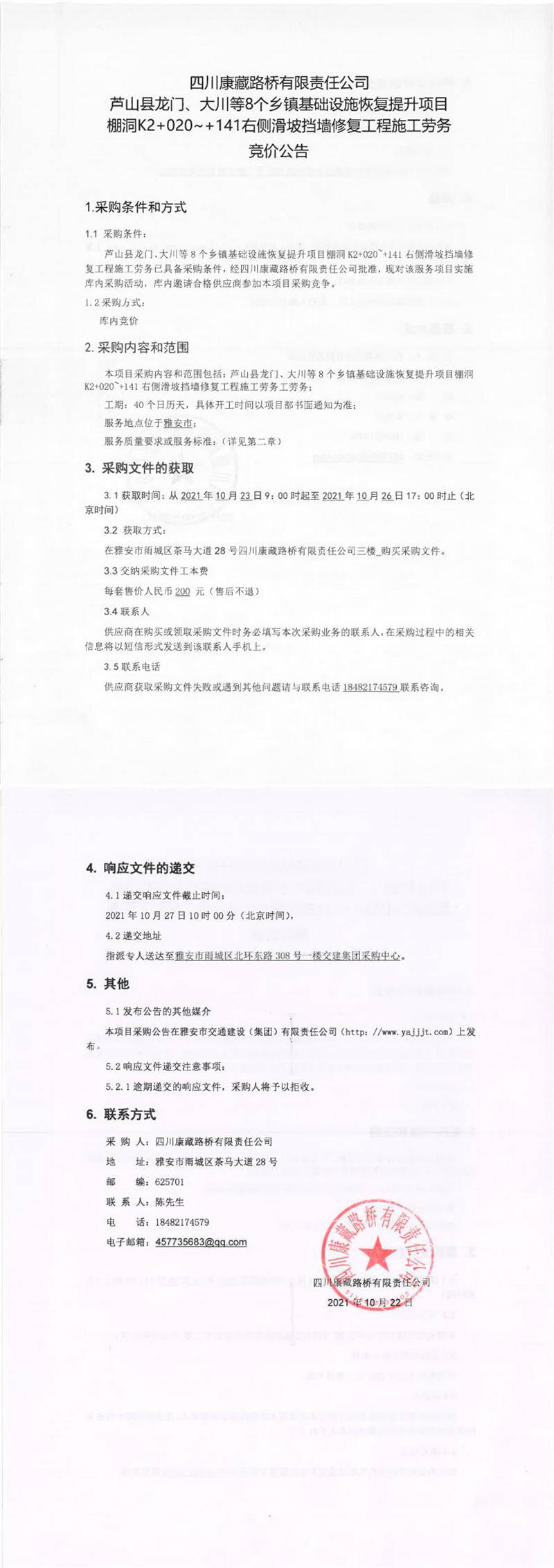四川康藏路橋有限責任公司蘆山縣龍門、大川等8個鄉(xiāng)鎮(zhèn)基礎(chǔ)設(shè)施恢復提升項目棚洞K2+020~+141右側(cè)滑坡?lián)鯄π迯凸こ淌┕趧?wù)采購競價公告