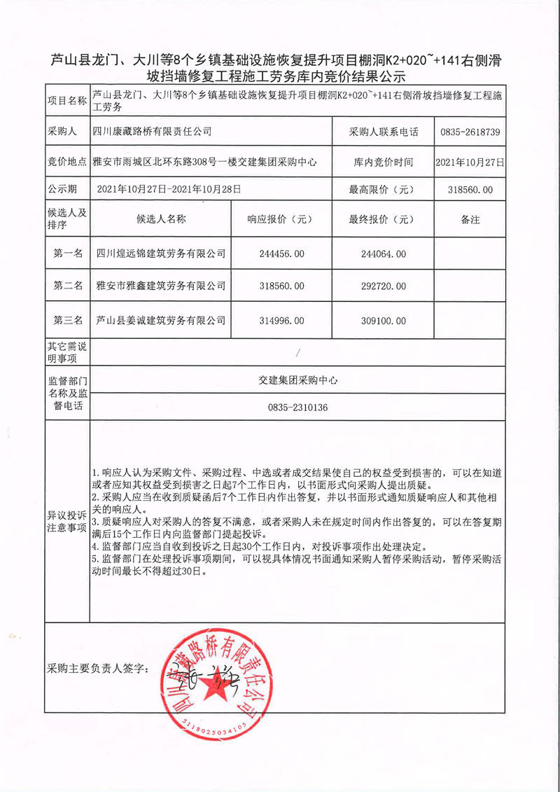 四川康藏路橋有限責(zé)任公司蘆山縣龍門、大川等8個(gè)鄉(xiāng)鎮(zhèn)基礎(chǔ)設(shè)施恢復(fù)提升項(xiàng)目棚洞K2+020~+141右側(cè)滑坡?lián)鯄π迯?fù)工程施工勞務(wù)庫內(nèi)競價(jià)結(jié)果公示