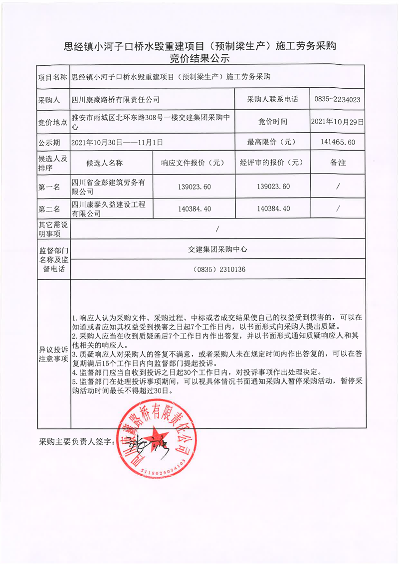 四川康藏路橋有限責任公司思經鎮(zhèn)小河子口橋水毀重建項目(預制梁生產)施工勞務采購競價結果公示