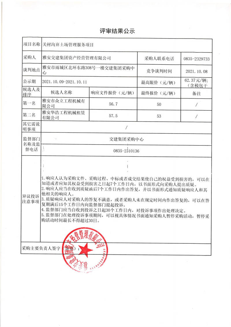 雅安交建集團(tuán)資產(chǎn)經(jīng)營管理有限公司關(guān)材溝棄土場(chǎng)管理服務(wù)項(xiàng)目評(píng)審結(jié)果公示