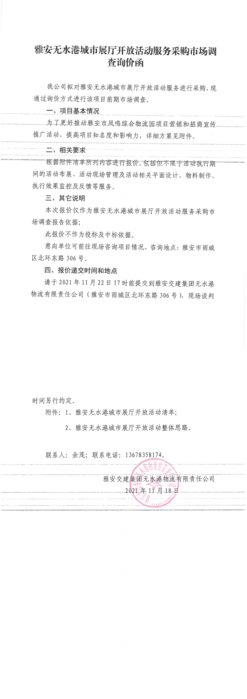 雅安交建集團(tuán)無水港物流有限責(zé)任公司雅安無水港城市展廳開放活動(dòng)服務(wù)采購市場調(diào)查詢價(jià)函