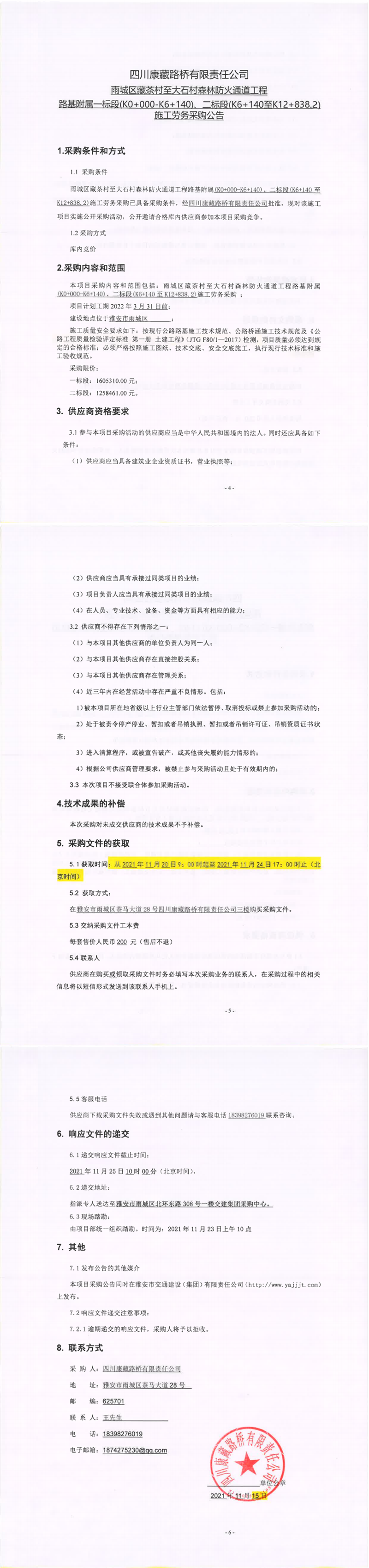 四川康藏路橋有限責(zé)任公司雨城區(qū)藏茶村至大石村森林防火通道工程路基附屬一標(biāo)段(K0+000-K6+140)、二標(biāo)段(K6+140至K12+838.2)施工勞務(wù)采購公告