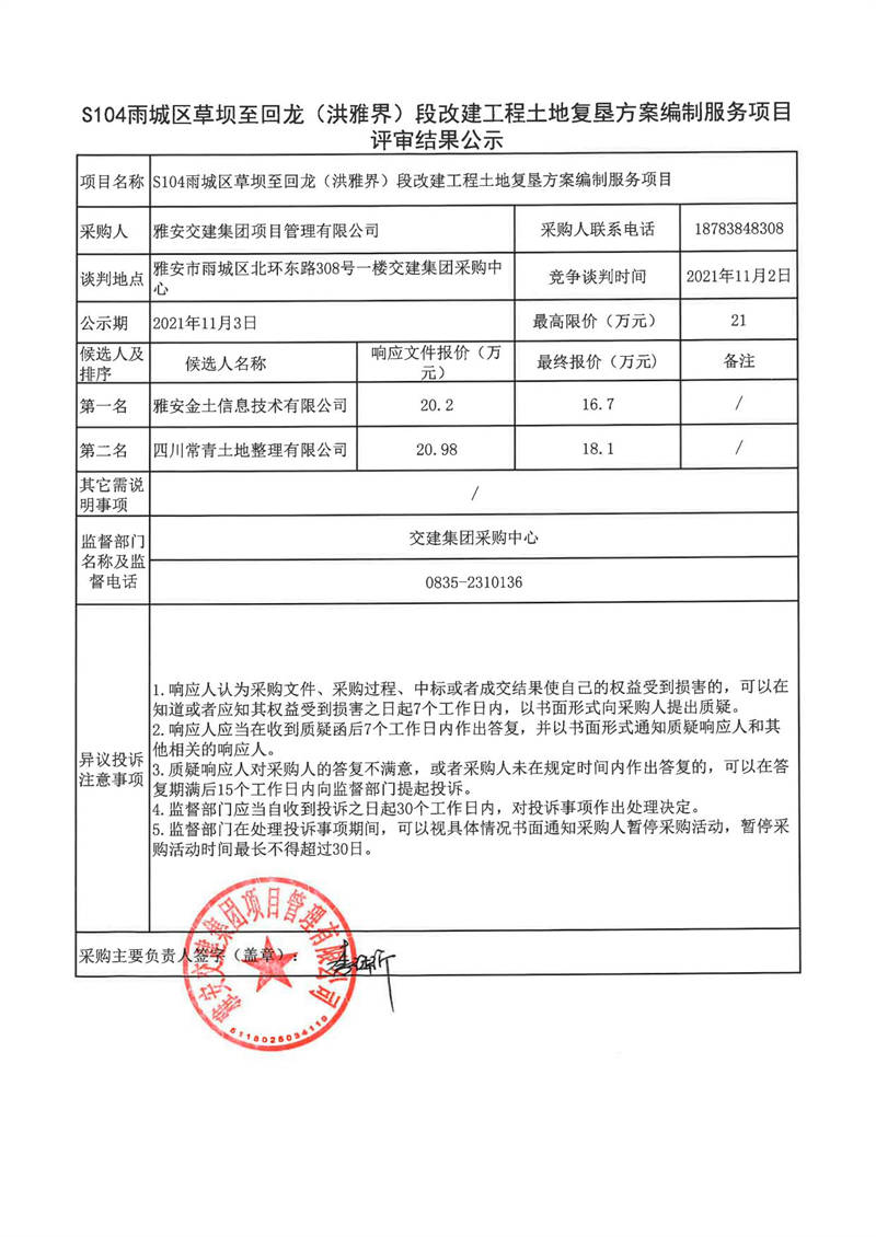 雅安交建集團項目管理有限公司S104雨城區(qū)草壩至回龍(洪雅界)段改建工程土地復墾方案編制服務項目評審結(jié)果公示
