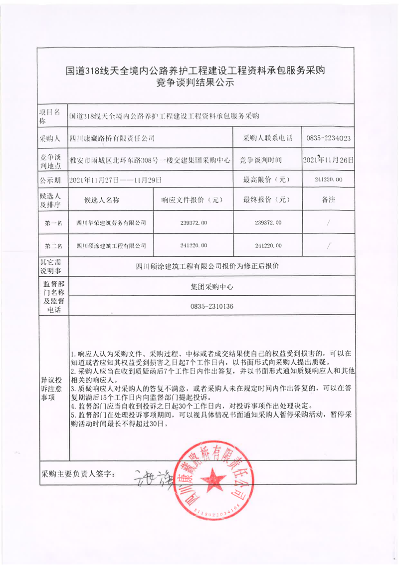 四川康藏路橋有限責任公司國道318線天全境內(nèi)公路養(yǎng)護工程建設(shè)工程資料承包服務(wù)采購競爭談判結(jié)果公示