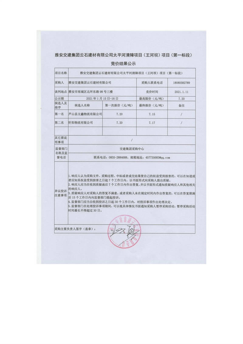 雅安交建集團云石建材有限公司太平河清障項目(王河壩)項目(第一標(biāo)段)競價結(jié)果公示