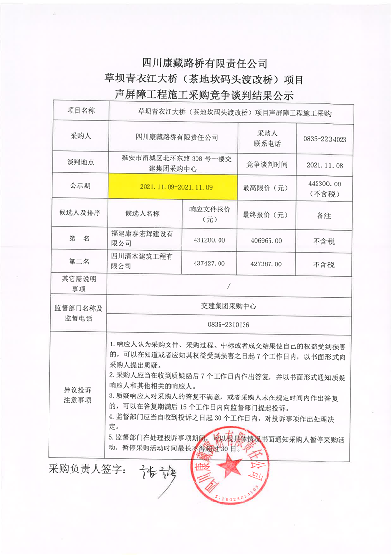 四川康藏路橋有限責(zé)任公司草壩青衣江大橋(茶地坎碼頭渡改橋)項(xiàng)目聲屏障工程施工采購競爭談判結(jié)果公示
